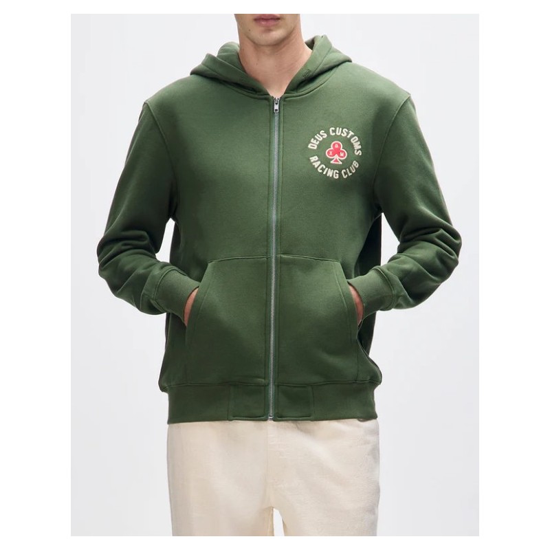 Nourrie par le café des arrêts au bord des routes et des autoroutes depuis longtemps oubliées, la sensibilité universitaire côtoie une nostalgie teintée de pétrole. Le sweat à capuche zippé Basto, coupe box fit, mêle rayures des stands et charisme des sentiers poussiéreux.